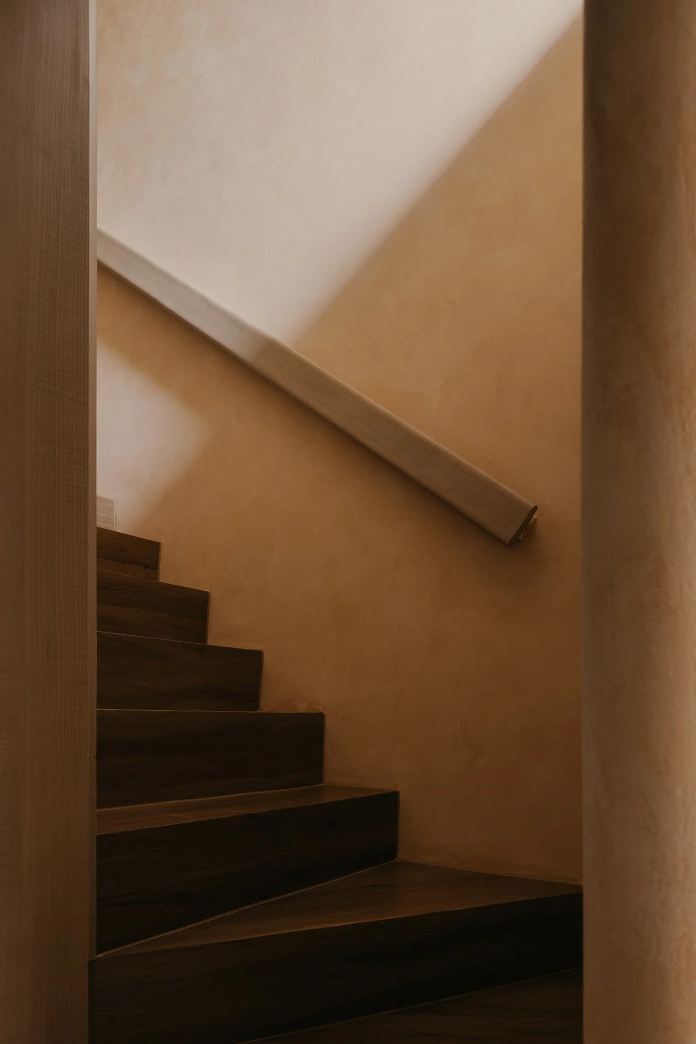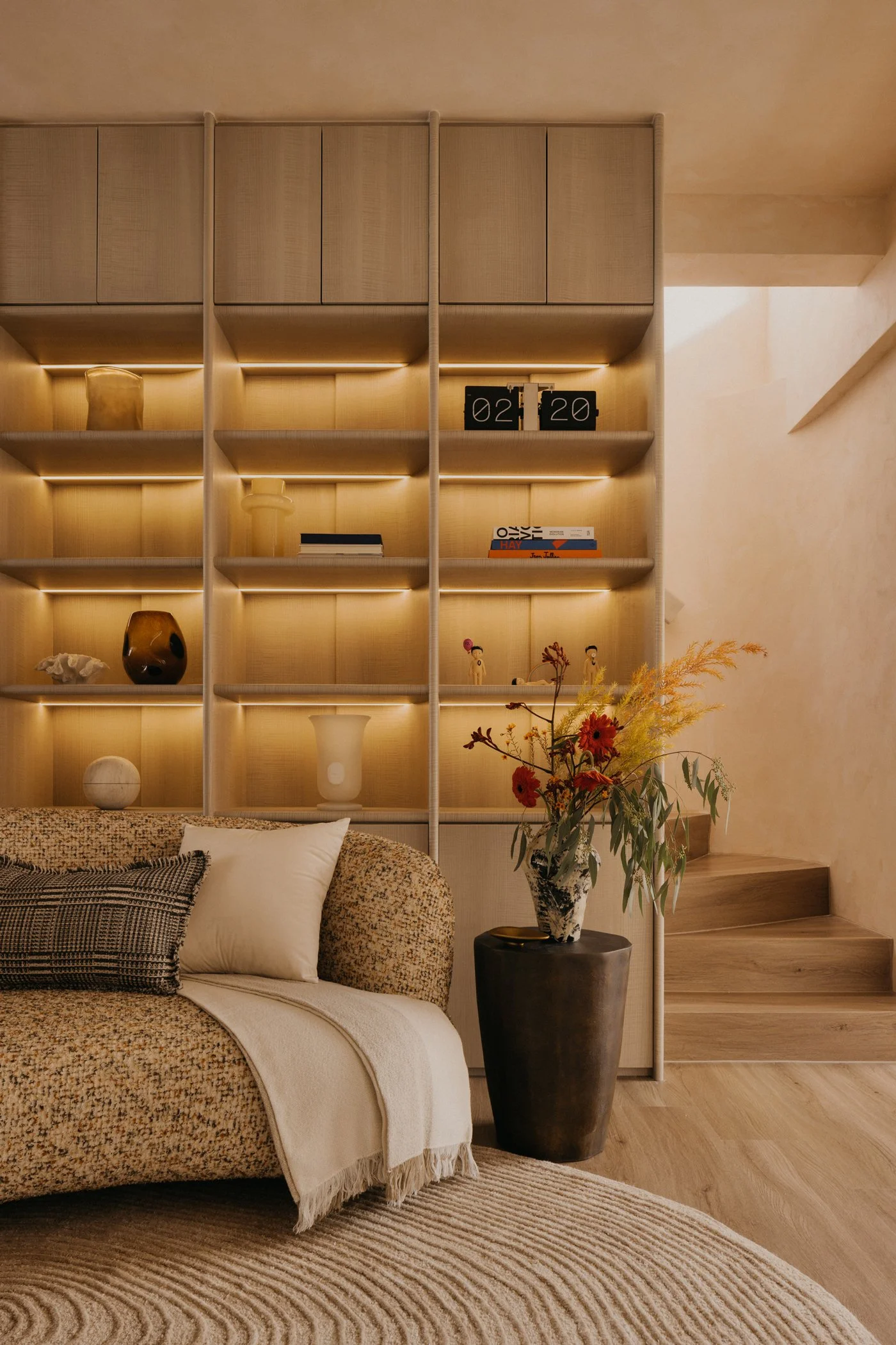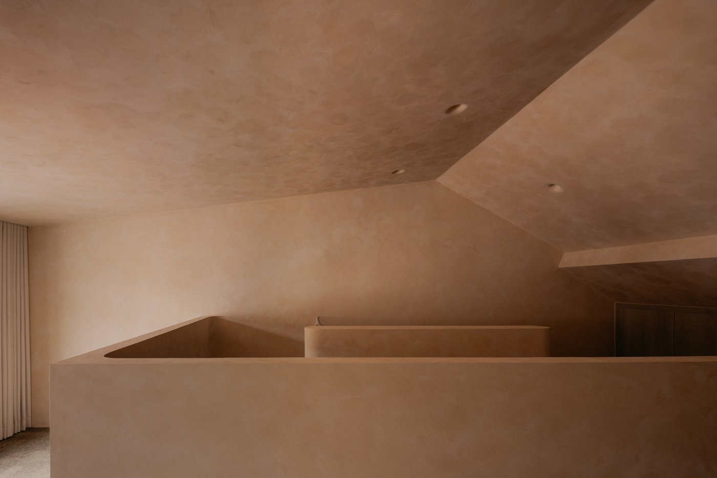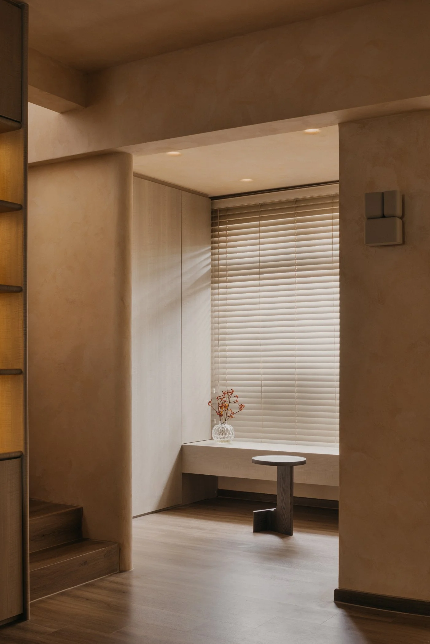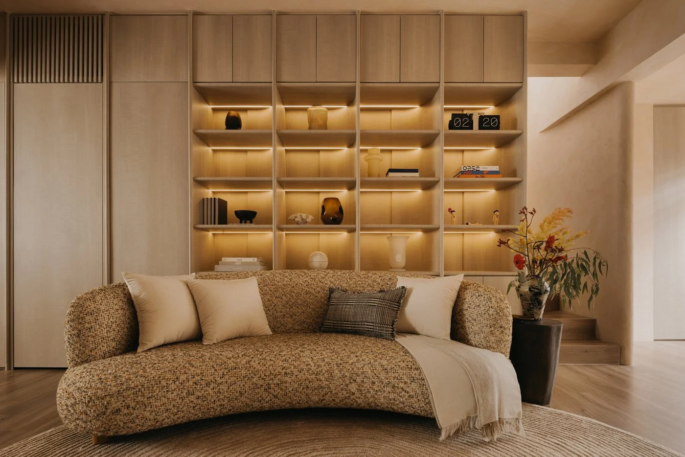 Most interior walls and volumes are shaped with gentle curves. Sharp intersections are softened, turning edges into continuous lines that reduce the sense of separation. As the body follows these rounded transitions and the eye moves between what is above and below, subtle moments appear: the corner beneath the stairs, the meeting point of wall and ceiling, the edge of a built-in cabinet. These quiet gestures encourage the shoulders to drop and the mind to ease, inviting people to feel how the home opens itself with a calm, welcoming warmth.