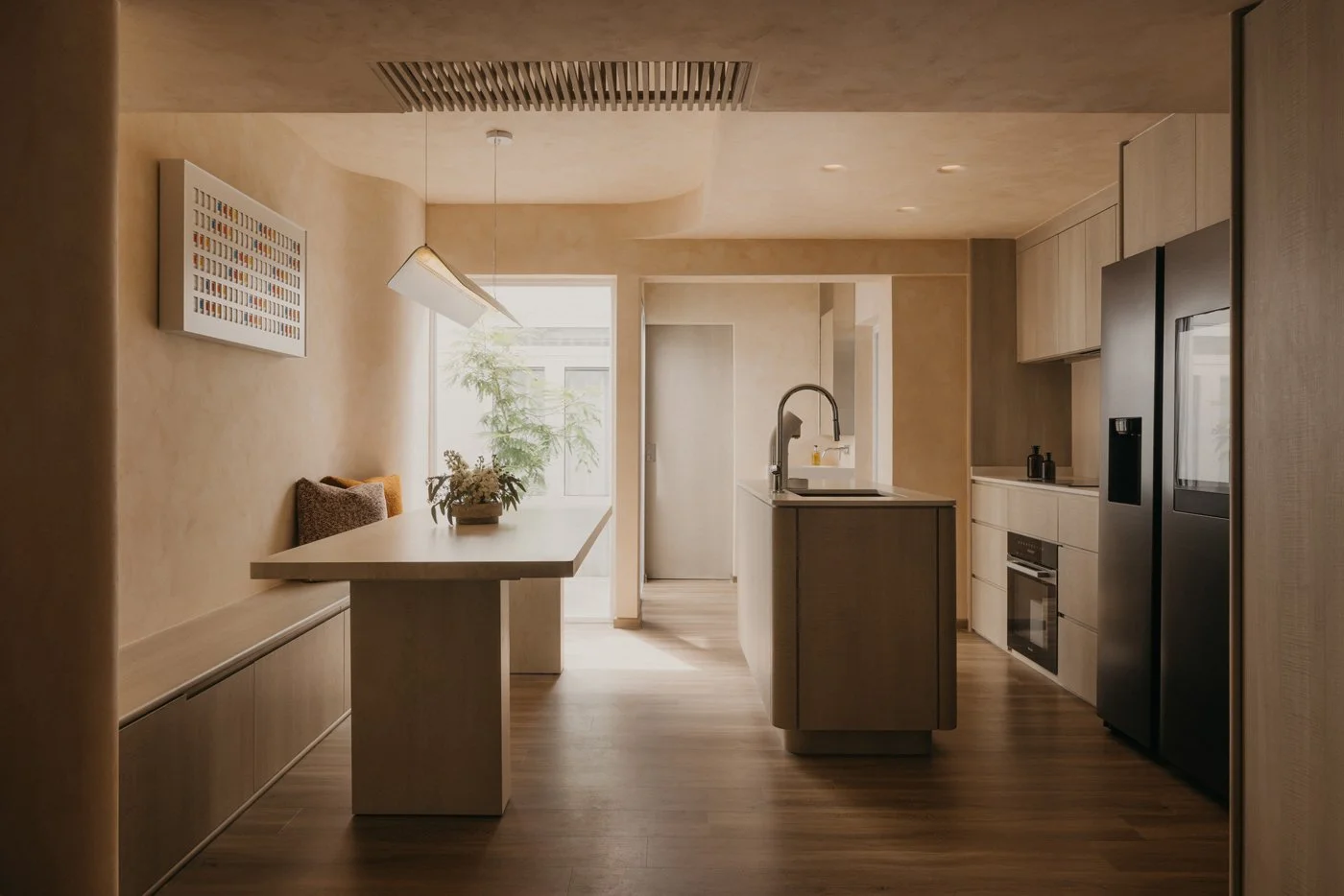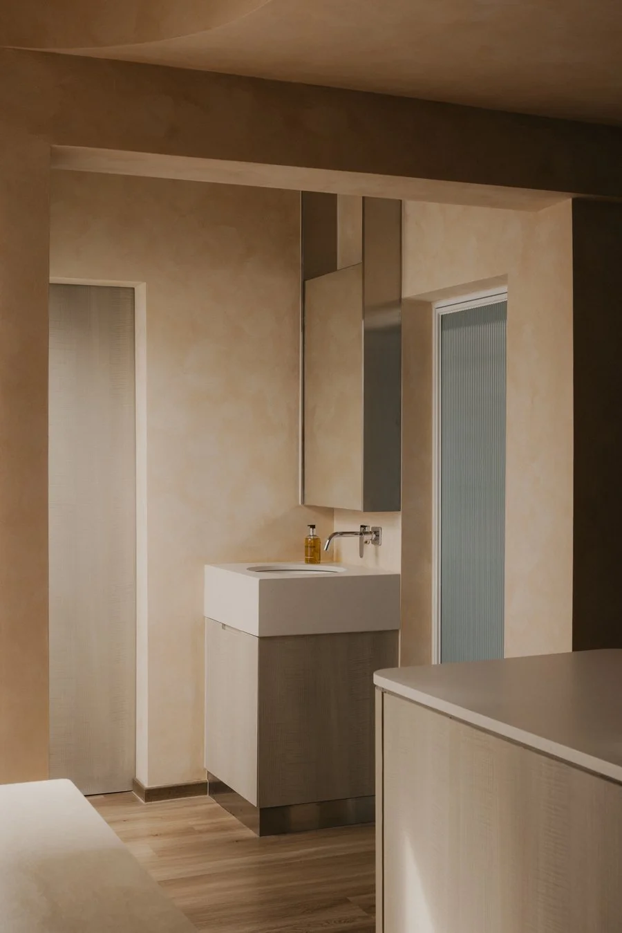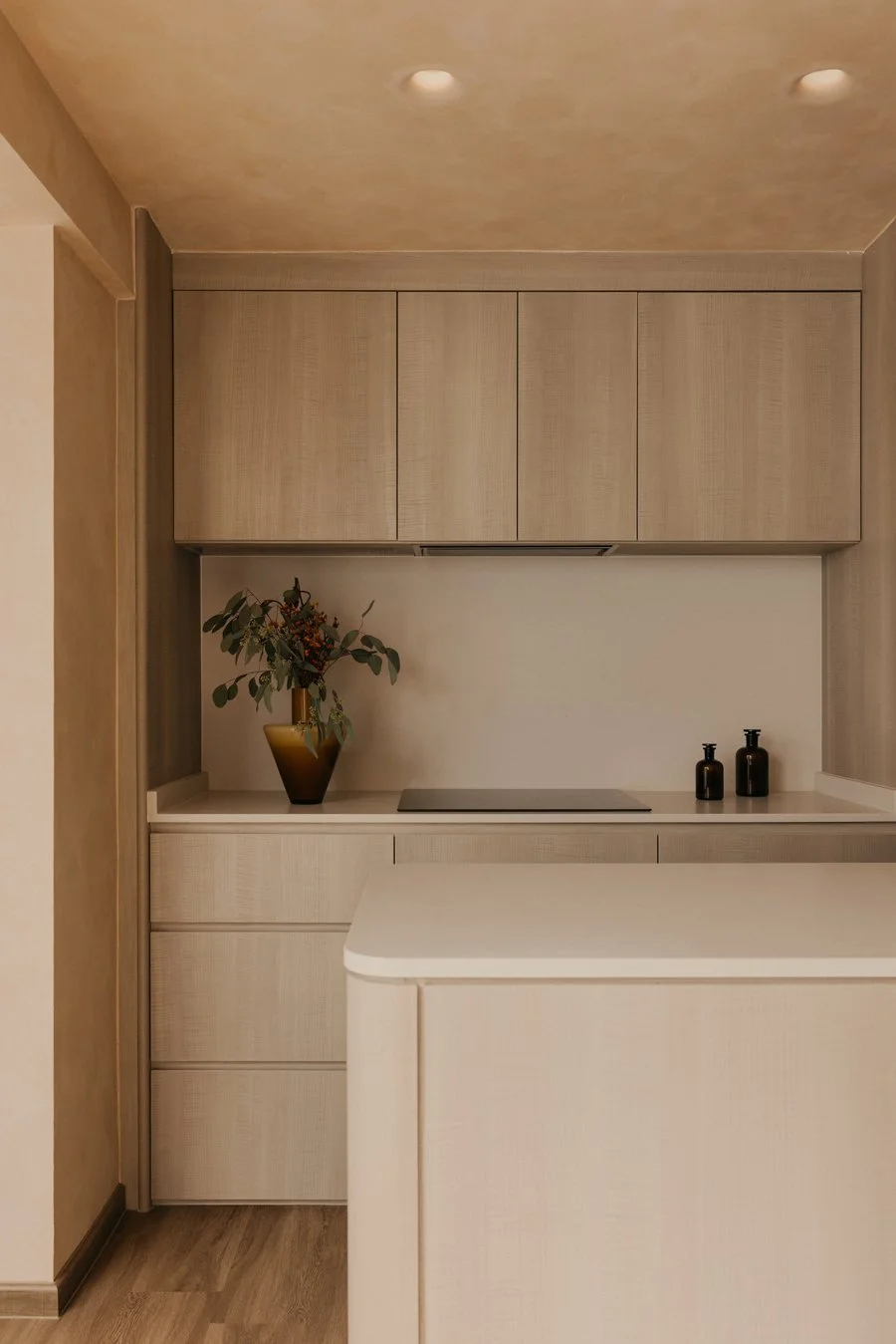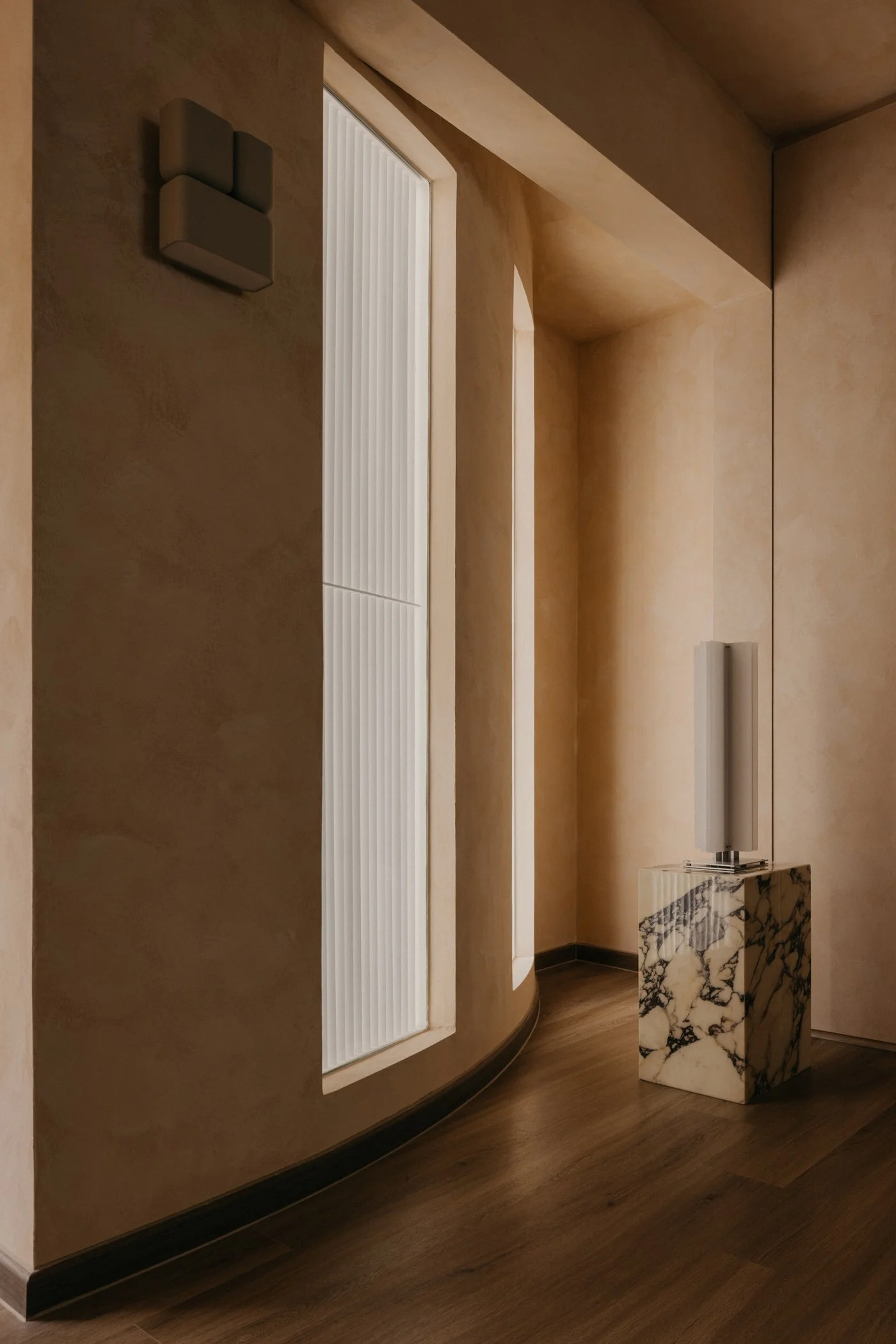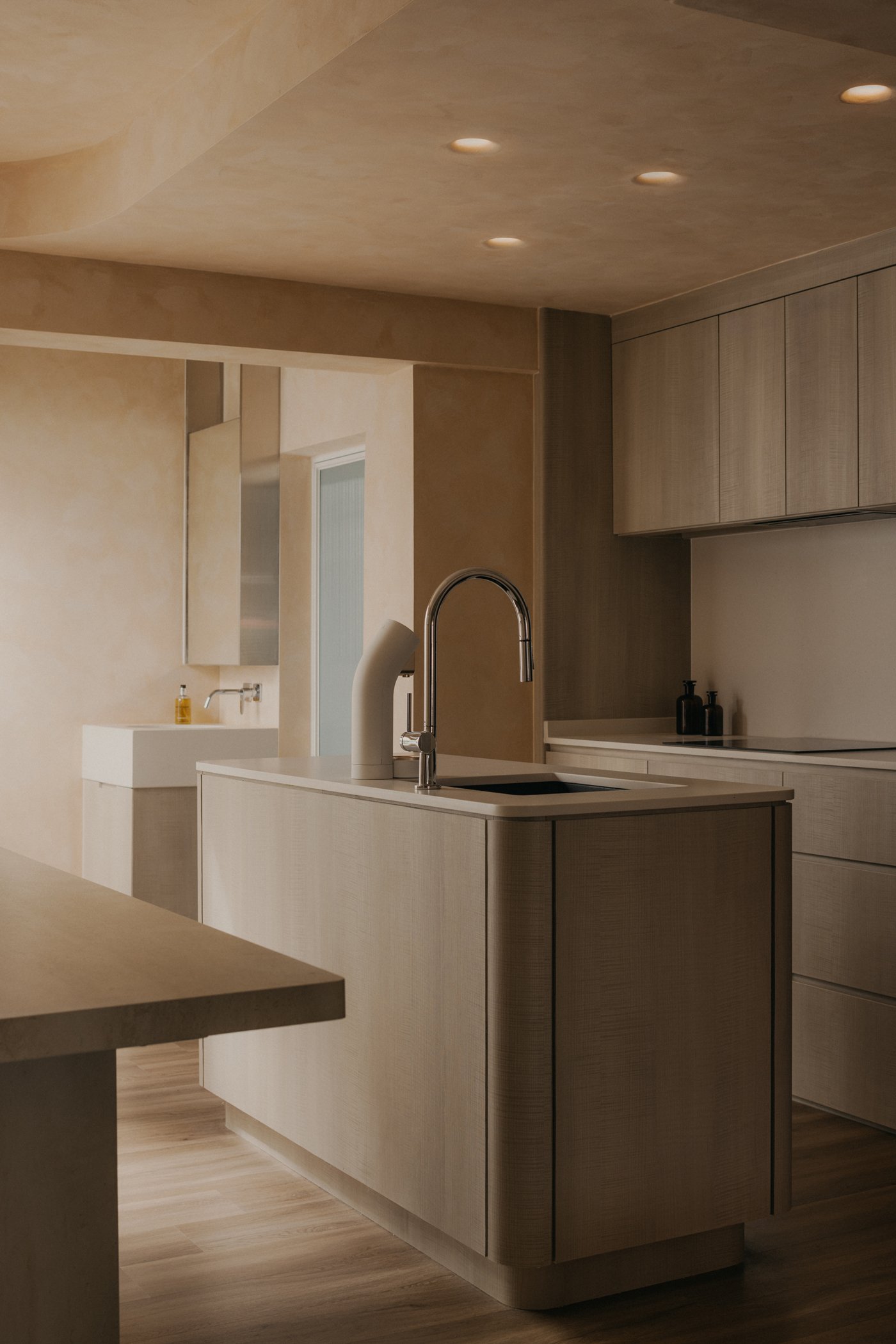 Most interior walls and volumes are shaped with gentle curves. Sharp intersections are softened, turning edges into continuous lines that reduce the sense of separation. As the body follows these rounded transitions and the eye moves between what is above and below, subtle moments appear: the corner beneath the stairs, the meeting point of wall and ceiling, the edge of a built-in cabinet. These quiet gestures encourage the shoulders to drop and the mind to ease, inviting people to feel how the home opens itself with a calm, welcoming warmth.